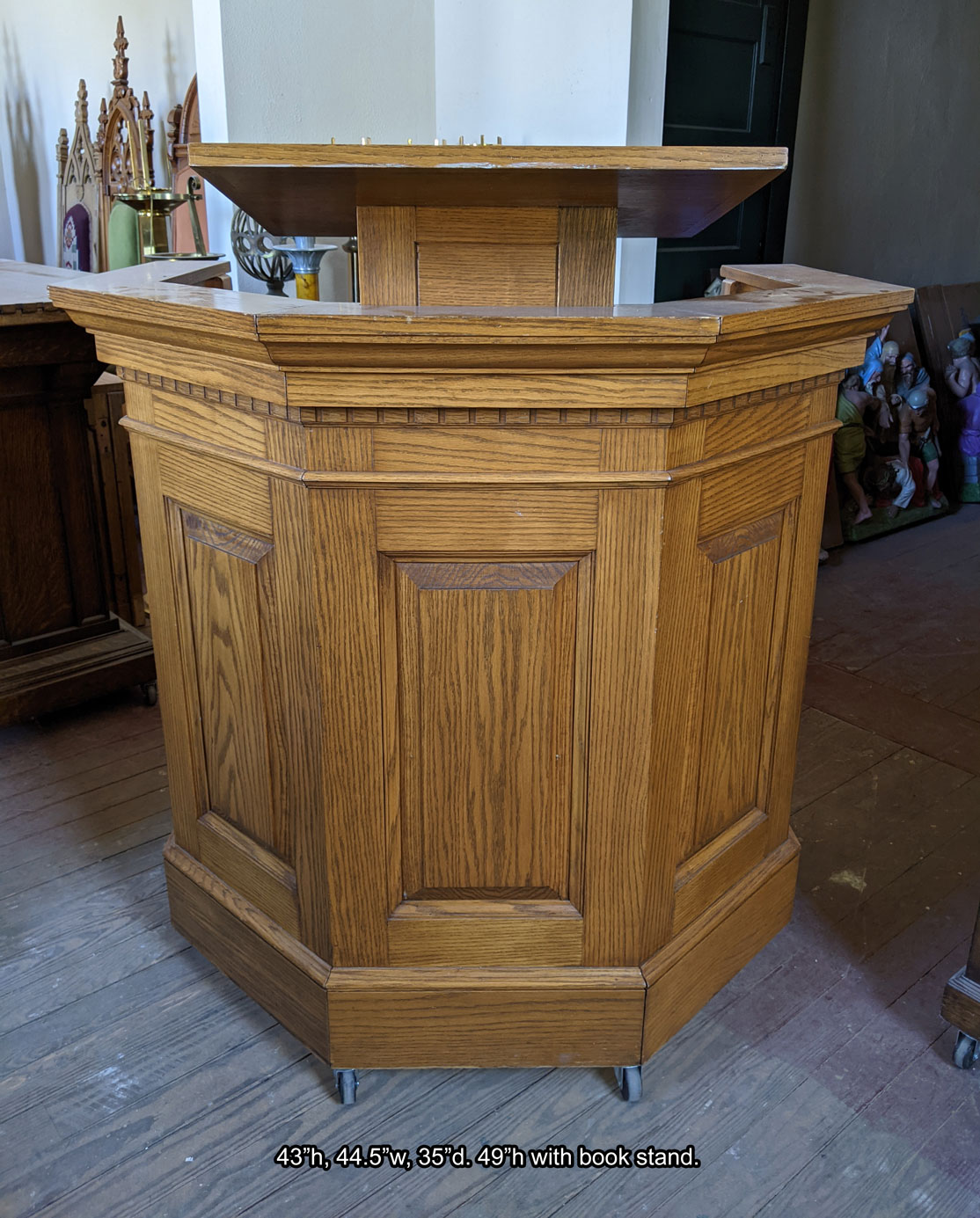 + Current inventory includes a large stair access raised high pulpit, an oak panel pulpit, a traditional antique walk-in podium and more.